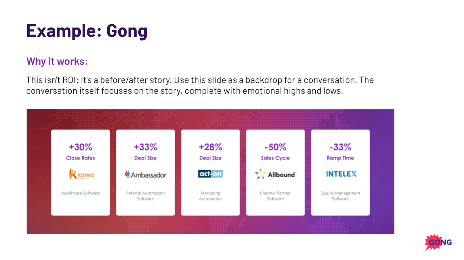 Slightly different from some of the other templates, Gong’s sales pitch deck actually walks you through the slides you’d normally include in a pitch deck and why you should leave them out. They then offer better alternatives. For example, cut the comparison slide and replace it with a value proposition slide.