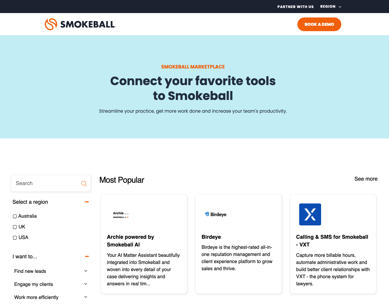 Smokeball serves firms across the US, UK, and Australia, and their marketplace adapts accordingly. Users see integrations that make sense for their jurisdiction, tooling landscape, and local workflows, all within the same underlying ecosystem.