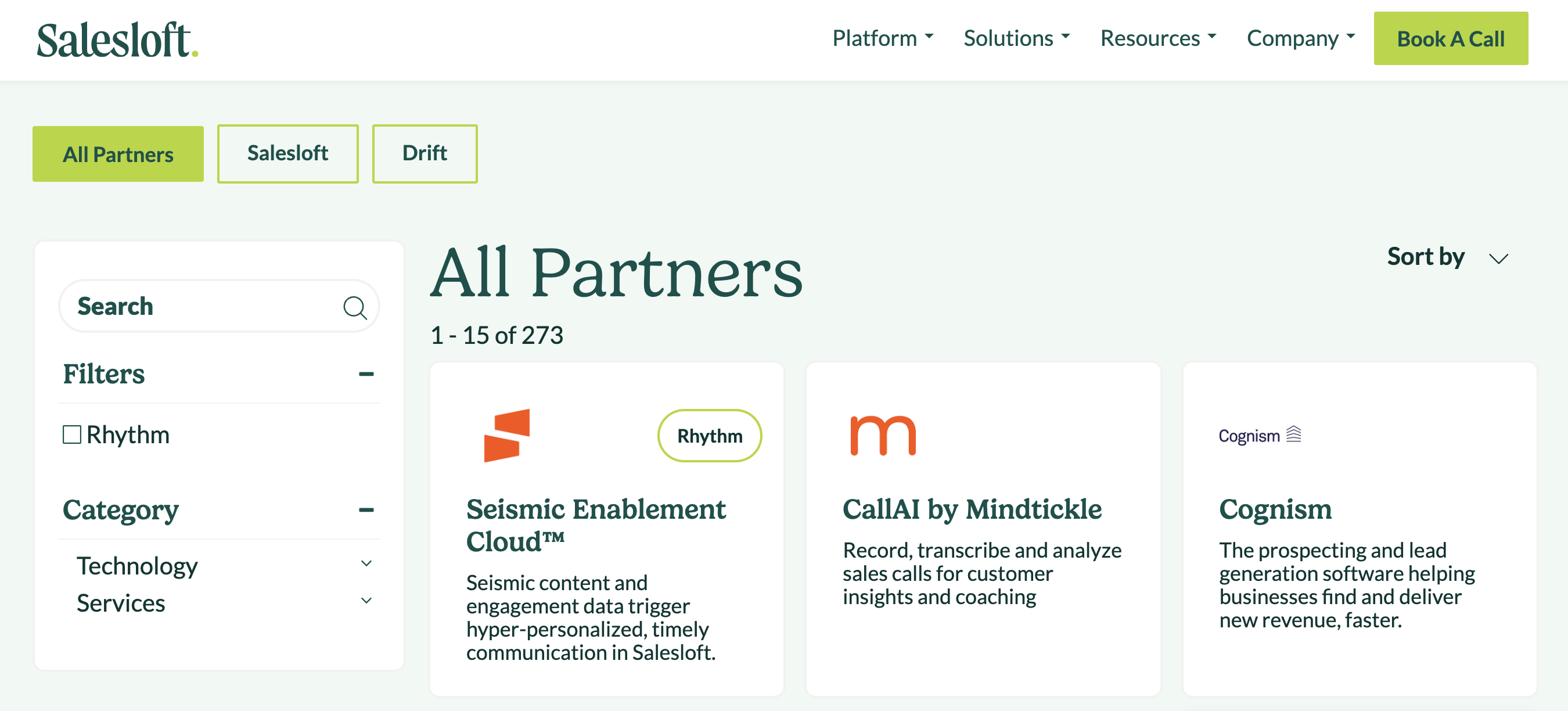 Front and center on the marketplace homepage is a featured partner, rotated monthly. This does more than spotlight an integration. It sends a clear signal to partners about where Salesloft is investing and what success looks like in the ecosystem.